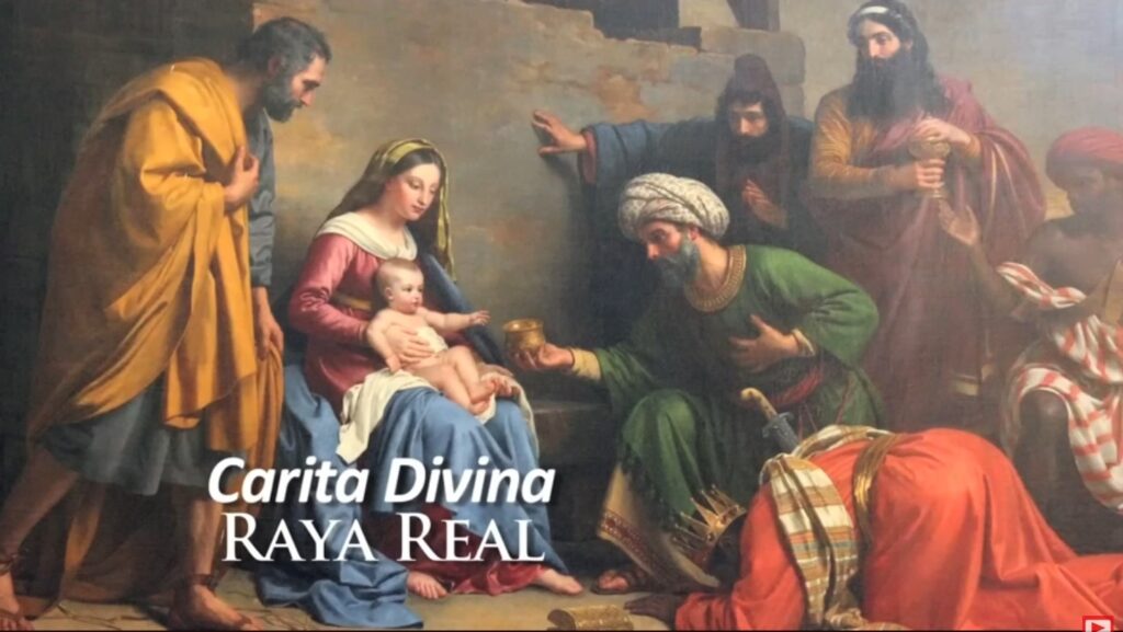 東方の三賢人(レジェス・マゴス)が降誕後のキリストにひれ伏す様子。19世紀のフランスの画家アレクサンドレ・フランソワ・カミネード作「Adoration des mages(1839年)」。今週ご紹介のラジャ・レアル「神々しきお顔」のトップ画像に使われている。