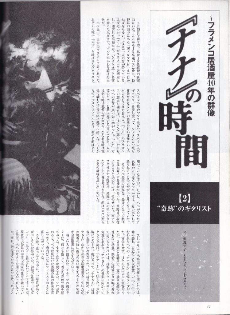 ぺぺ島田。日本のフラメンコ界にあって、おそらく唯一「天才」と呼ばれたギタリスト。スペインの舞台やフエルガで、スペイン人のギタリストを差し置いて、フラメンコで最も尊敬されるカンテの名匠たちの伴奏をいくつもこなしてきた日本人。『ナナ』のフラメンコの歴史を問えば、ほとんど誰の口からも、ペペの名前が真っ先に挙がった。「ナナ」で 彼のギターと共に過ごした日のことを、人々はある時は親愛の情をこめ、またある時は憧憬に満ちた声音で実に饒舌に語った。古くからのフラメンコファンなら、彼の名前はよく知っているはずだ。 しかし、ぺぺがめったに 表舞台に出なくなってからは、思い出として 語られることの方がずっと多くなっていた。